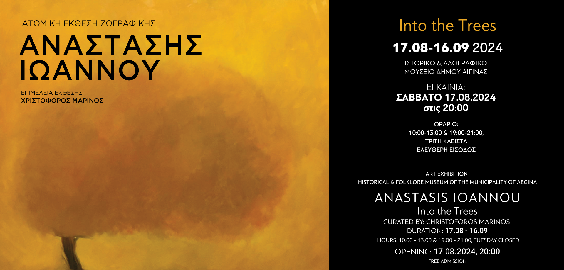 Το Λαογραφικό Μουσείο Αίγινας φιλοξενεί την ατομική έκθεση ζωγραφικής «Into the Trees» του Αναστάση Ιωάννου. Η έκθεση, σε επιμέλεια του ιστορικού τέχνης Χριστόφορου Μαρίνου, πραγματοποιείται στο πλαίσιο του 15ου Aegina Fistiki Fest και είναι η δεύτερη ατομική του καλλιτέχνη στο νησί μετά τους «Αρλεκίνους» του 2020.