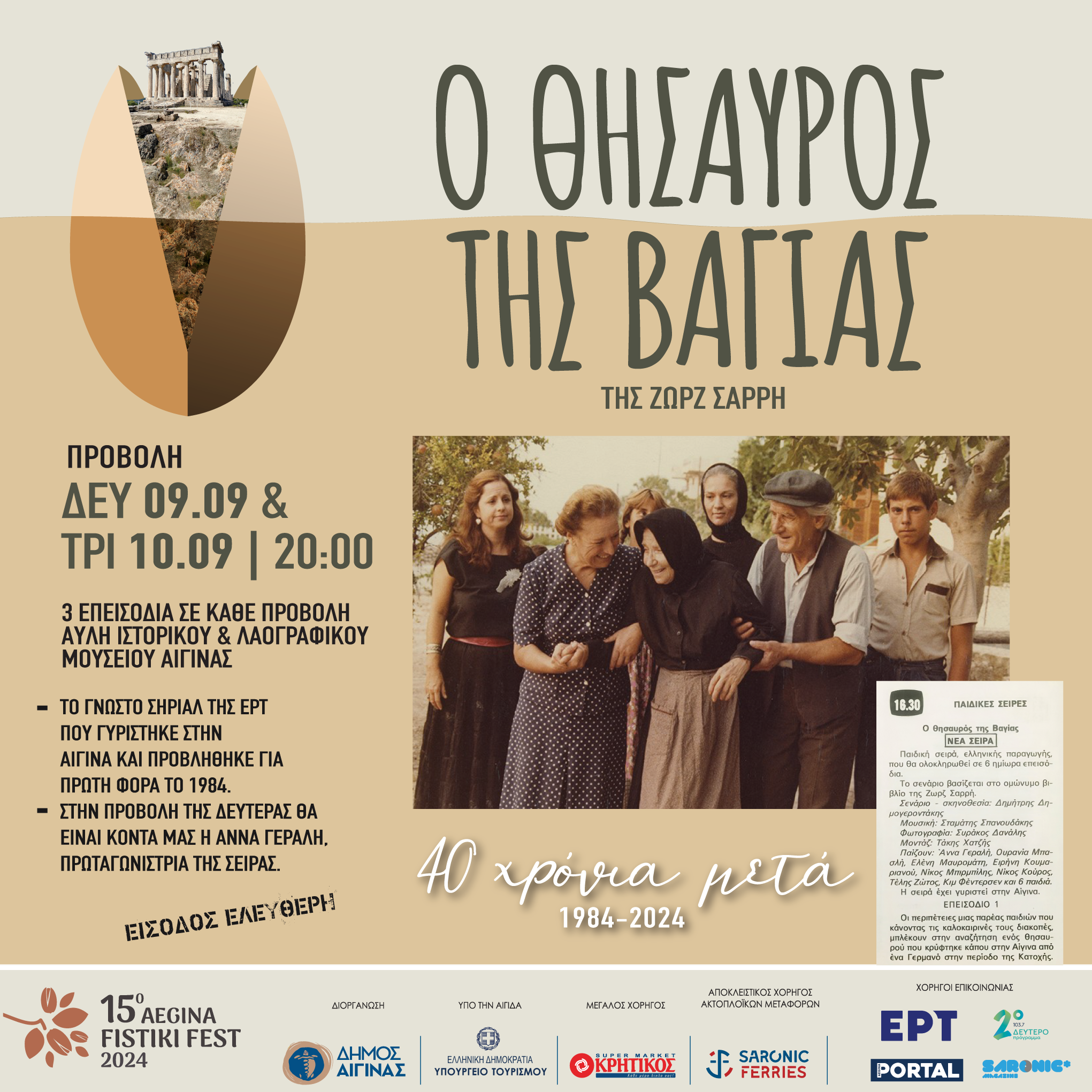 40 χρόνια μετά, ο τηλεοπτικός «Θησαυρός της Βαγίας» έρχεται στην Αίγινα, στο νησί στο οποίο εκτυλίσσεται η ιστορία. Τα 6 ημίωρα επεισόδιά του θα προβληθούν σε δύο συνεχόμενες προβολές, τη Δευτέρα 9 και την Τρίτη 10 Σεπτεμβρίου, στις 20:00, στην αυλή του Ιστορικού και Λαογραφικού Μουσείου του Δήμου Αίγινας.